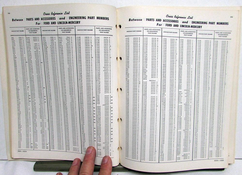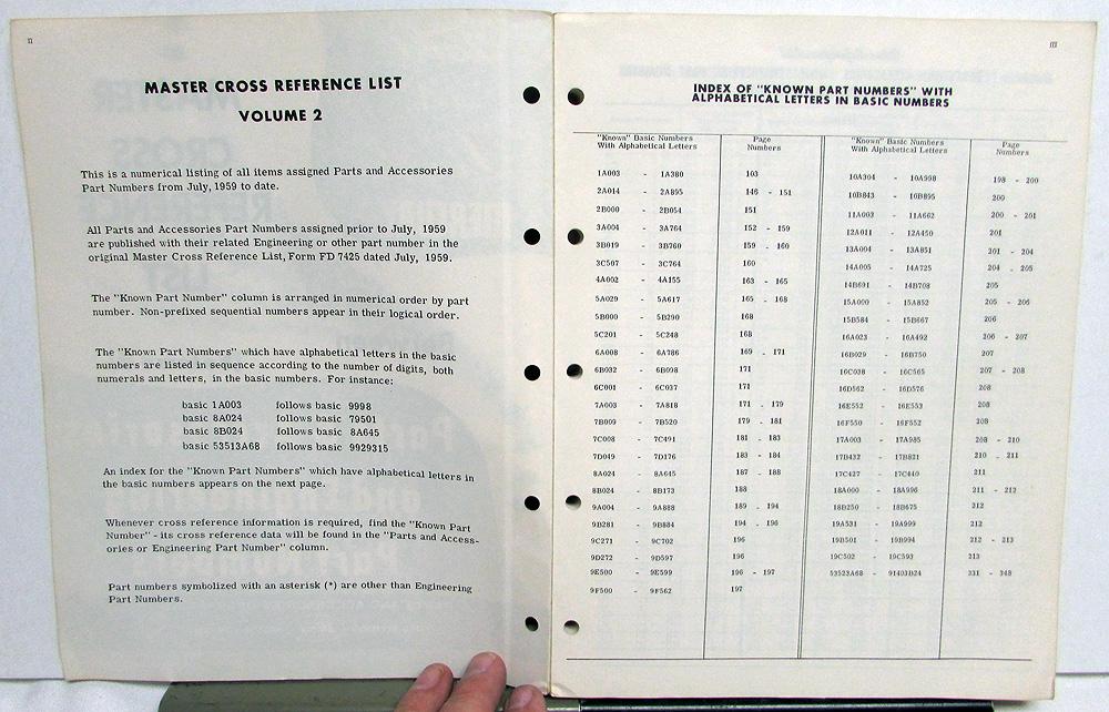 Original 1962 Ford, Lincoln, Mercury Dealer Master Cross Reference List [Volume 2]. This Parts & Accessories and Engineering Part Numbers Cross Reference Book [FD-7425-2] is a numerical listing of all Part Numbers from July, 1959 to October 1962. Very rare and useful tool for the Ford Owner or Enthusiast. It is in good condition with minor wear and soiling [see photos].