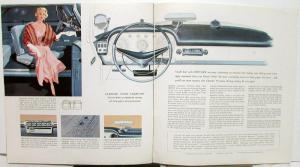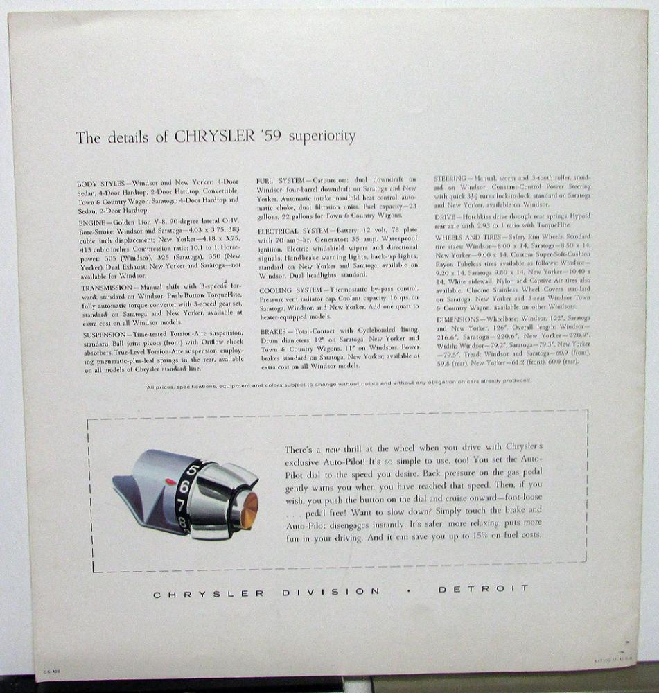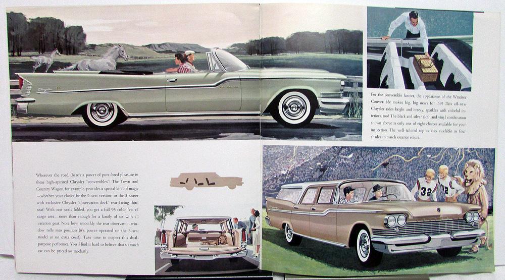1959 Chrysler New Yorker, Saratoga, & Windsor, color, prestige, dealer sales brochure with three double-sided, fold-out pages inside brochure. Very vibrant, colorful illustrations showing models/styles indicating color choices of exteriors and interiors. Read about features, options, engines, and specifications. Includes illustrations of convertible and wagon. This large and beautifully illustrated Brochure is in very good condition with minor wear and discoloration [see photos].
