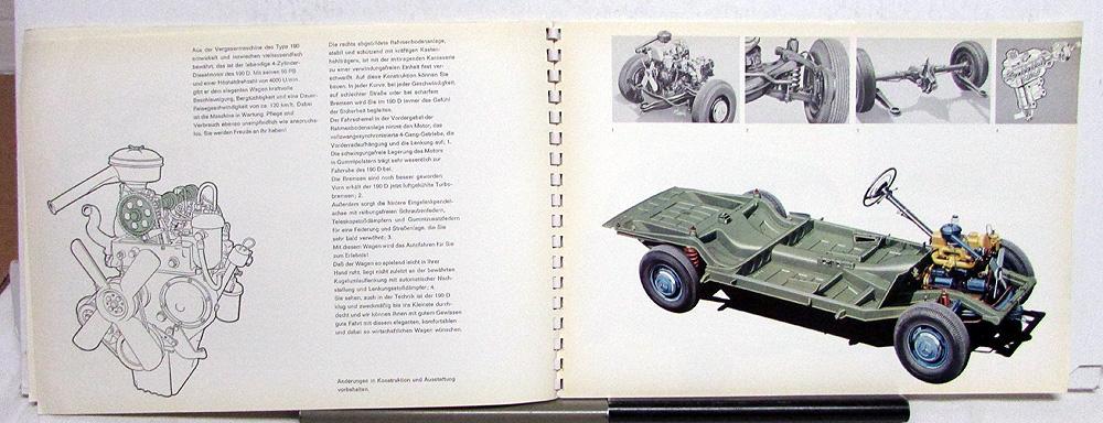 Original 1959 Mercedes-Benz Foreign Dealer Sales Brochure. This spiral bound Brochure has German Text and it highlights the 190 D Models. It is beautifully illustrated and has a pouch on the back cover that holds a Specifications Sheet. It is in good condition with minor wear, blemishing and soiling [see photos].