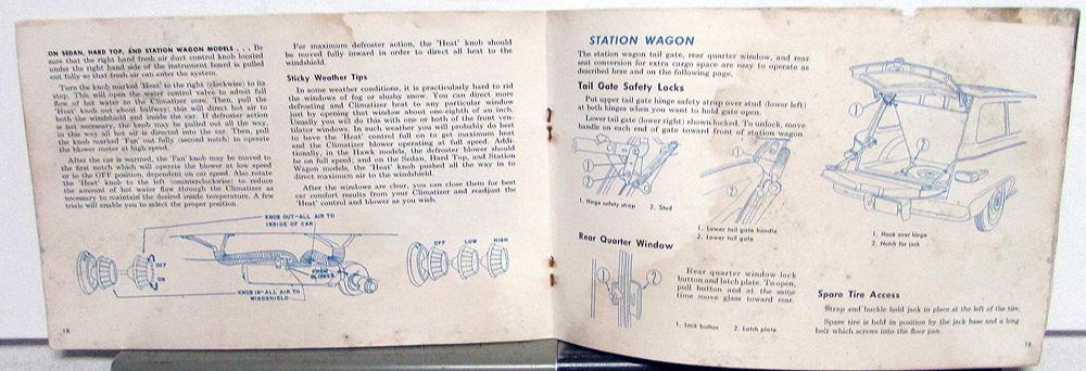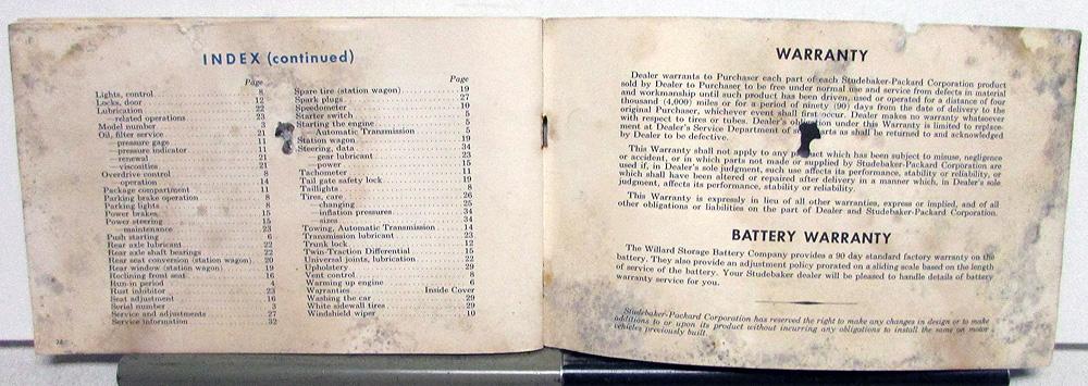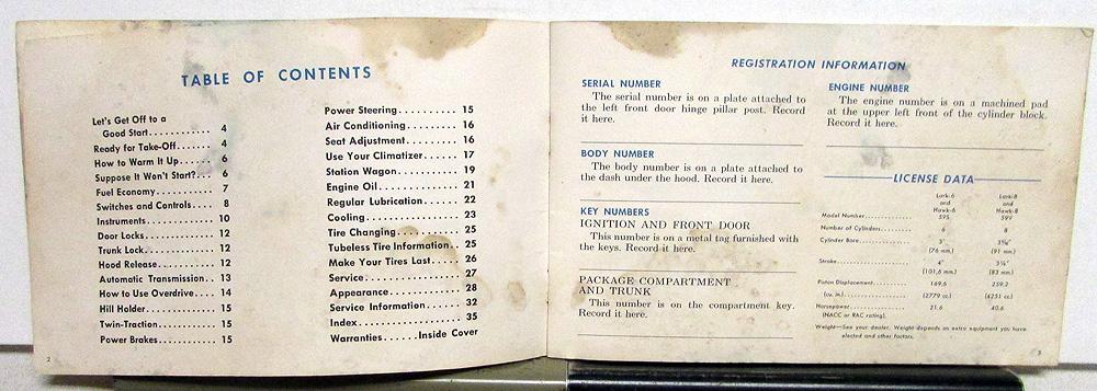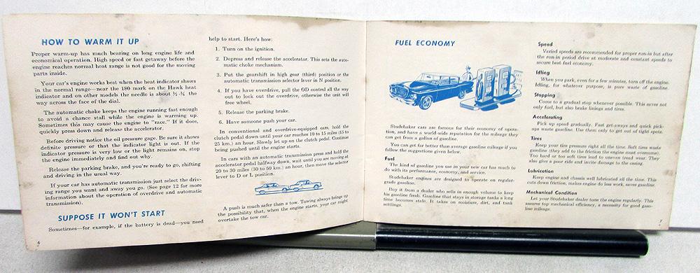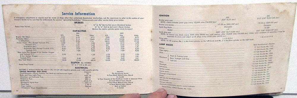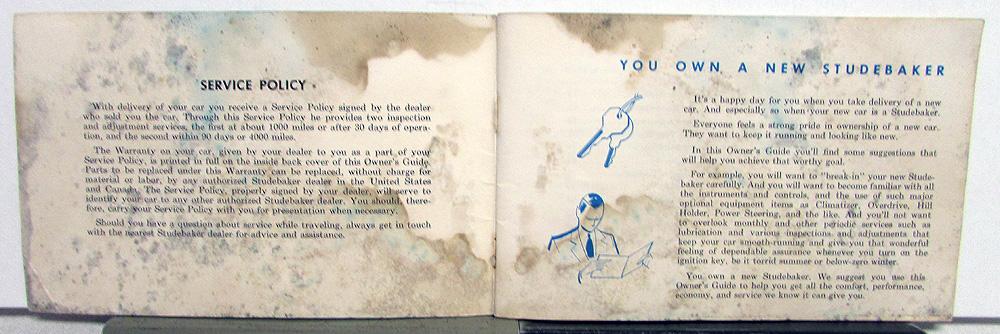 Original, used 1959 Studebaker Owner's Manual/Guide for Lark 6 & 8, and Hawk 6 & 8. Covers breaking in your new car, instruments and controls, equipment, monthly and periodic services, oil chart, etc., and specifications. It is in fair condition with some wear, blemishing and soiling [see photos].