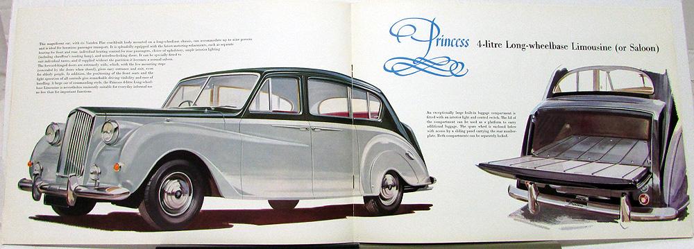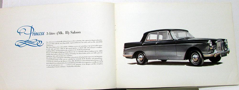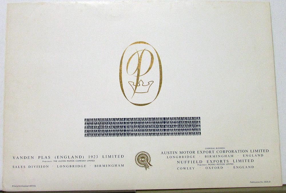 Original, sales brochure, features the Vanden Plas (coachworks) Princess saloon and limousines by British Motor Corporation of London. Publication no. 1823/D, printed in England. Clean, color, pages inside. Overall in good condition. Includes specifications and some color illustrations of exteriors and interiors.