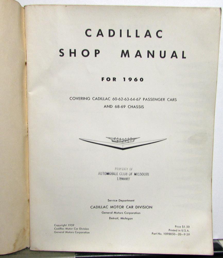 Original Cadillac (Service) Shop Manual Supplement for 1960, must be used with the 1959 Cadillac service manual for complete coverage. Covering Cadillac 60-62-63-64-67 Passenger Cars & 86-69 Chassis. Covers: body, frame, suspension, brakes, engine, clutch, transmission, fuel, exhaust, steering, wheels/tires, chassis, electrical, radiator, lubrication, etc. Good used condition with minor wear and soiling [see photos].