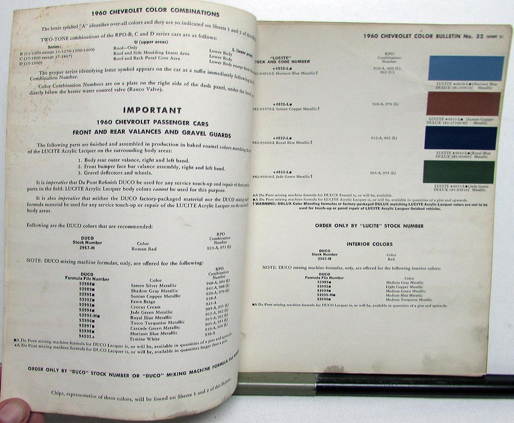 This is an original color bulletin that features the 1960 Chevrolet model's paint chips. It is in good condition for its age with some wear and soiling [see photos]. This is a great piece of history and a must-have for any automotive enthusiast!