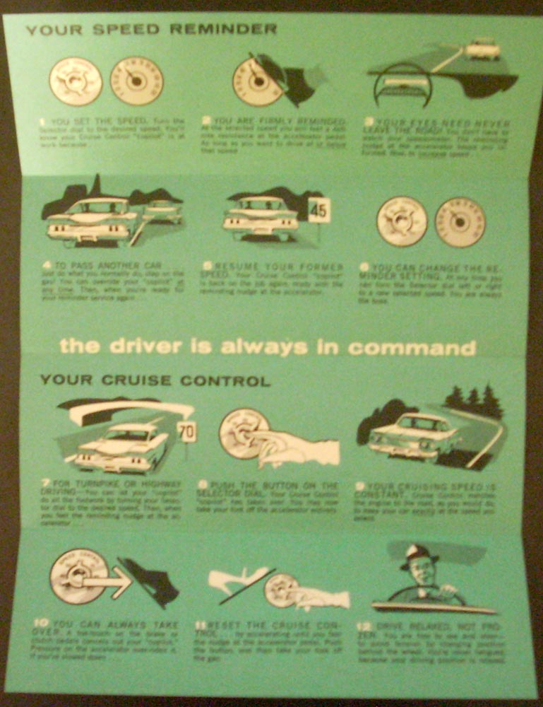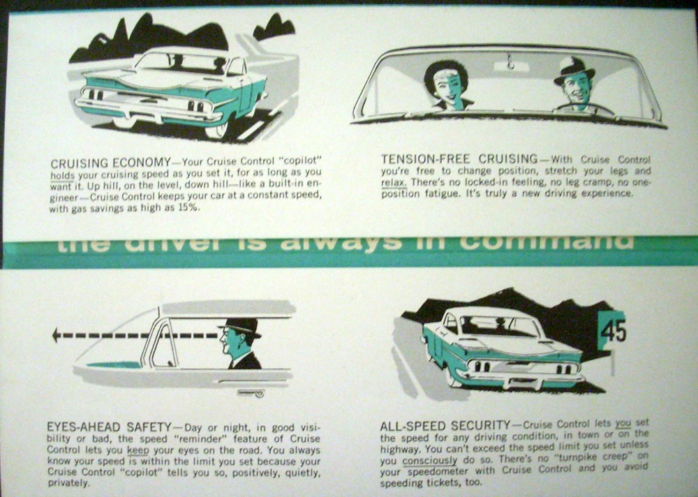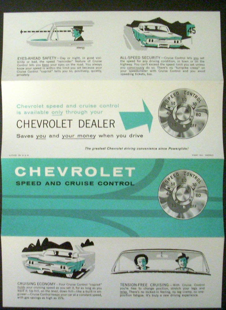 Good original NOS 1960 Chevrolet Speed and Cruise Control Dealer Sales Brochure. It measures 2.75" X 8" and opens to 8" X 11". Very informative Brochure on the Features and Benefits of Chevrolet's Cruise Control. Very cool piece for Car Owner or Collector. Don't miss your chance at this very rare piece of automotive history. It will make a great display piece. It is in very good condition for its age.