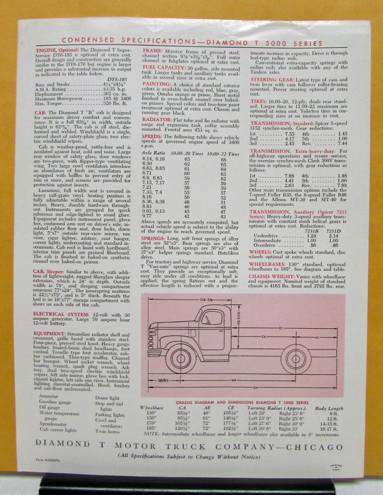 1960 Diamond T Truck 5000 Series Specification Sheet. Models included are 5000 and 5020.