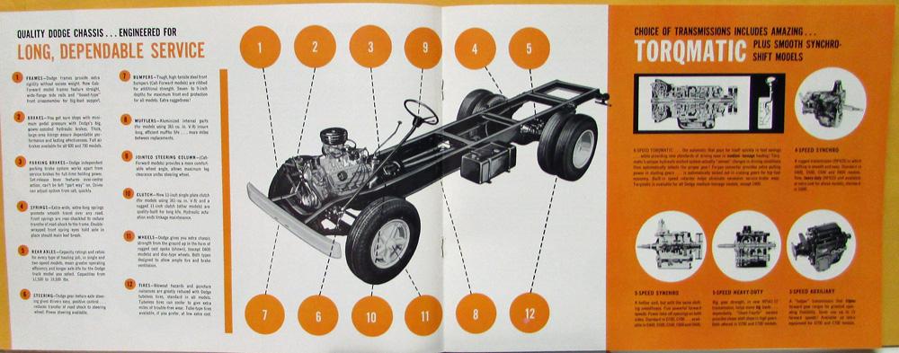 Original, 1960 Medium-Tonnage Models D400, D500, D600, D700, C500, C600, C700 Dodge Trucks color, sales brochure. Read about engines, transmissions, chassis features, specifications and dimensions. Contains photos and illustrations. Very good condition.