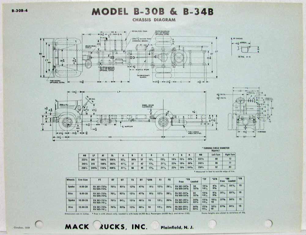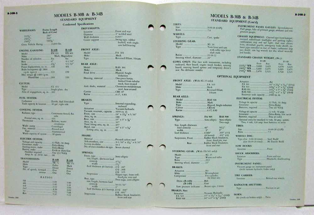 1960 Mack Truck School Bus Chassis Models B30B & B34B Spec Sheet. October 1959. Condition: Hole punched. Some soiling/discoloration around the edges. See pics.