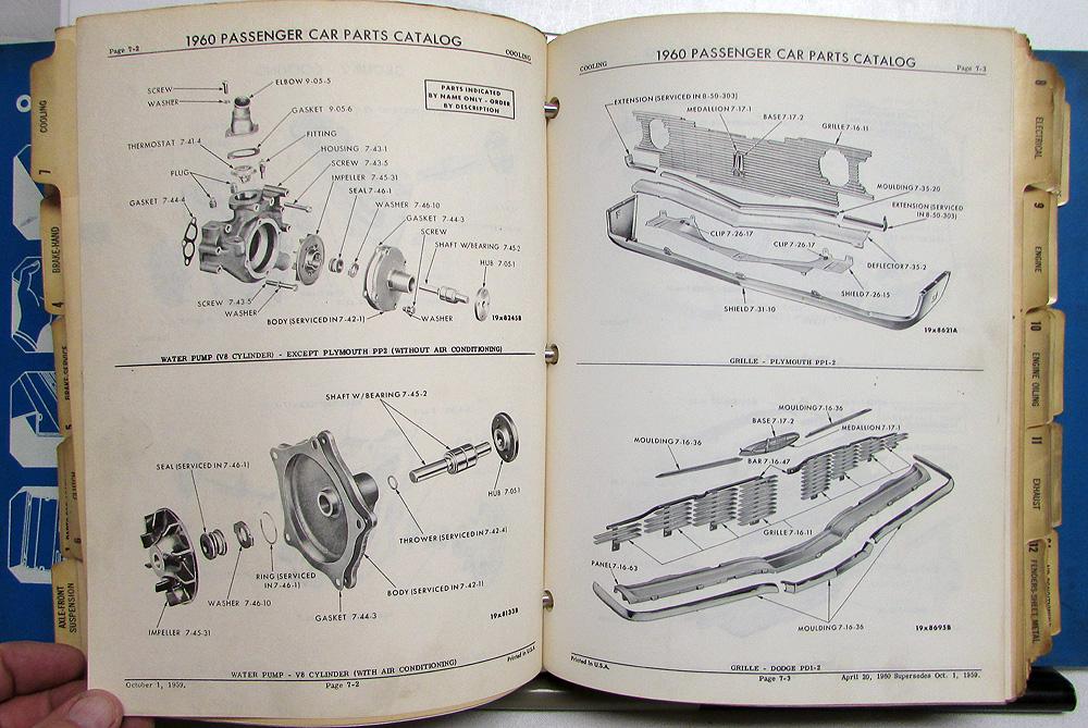 This publication contains parts information for the 1960 Model Passenger Cars. In the event replacement parts are required which are not listed in the publication, they may be ordered by description (or Part Type Code) giving the model or serial number fo the vehicle to which they apply. Trim items, such as seat backs, seat cushions and trimming materials are not listed and should be ordered by description and car serial number. Note: Parts List/Books, much like service manuals, can be valuable tools when working on and/or restoring a vehicle. For the uninitiated, keep in mind that these manuals were never meant as restoration manuals, as that is not within the regular scope of work done by dealership service departments (even today).
