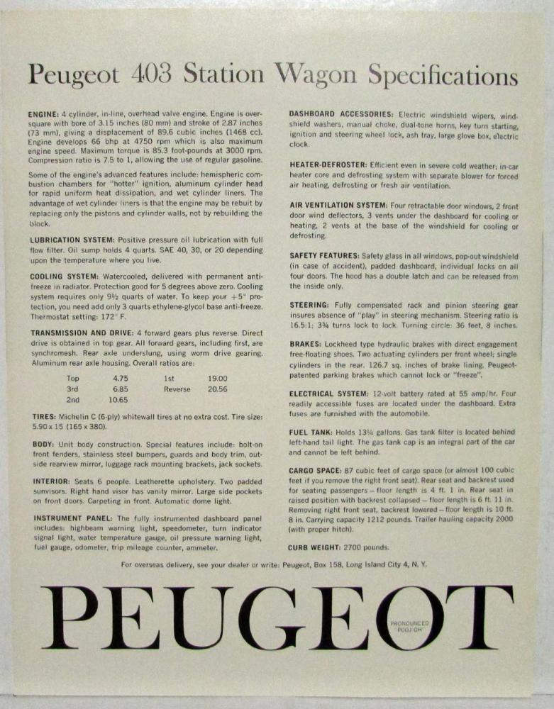 1960 Peugeot 403 Station Wagon Spec Sheet.