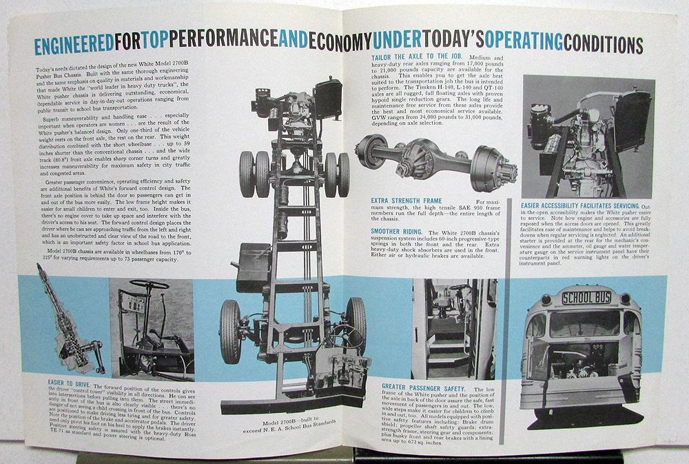 1960 White Pusher Bus Chassis Sales Brochure. Pusher bus chassis for better ... bus performance, economy, and durability. Model 2700B featured. Engineered for top performance and economy under today's operating conditions. Today's needs dictated the design of the new White Model 2700B Pusher Bus Chassis. Built with the same thorough engineering and the same emphasis on quality in materials and workmanship that made White the world leader in heavy duty trucks, the dependable service in day-in-day-out operations ranging from public transit to school bus transportaion. Features White Super Mustang Power. Good condition with minor wear and soiling [see photos].