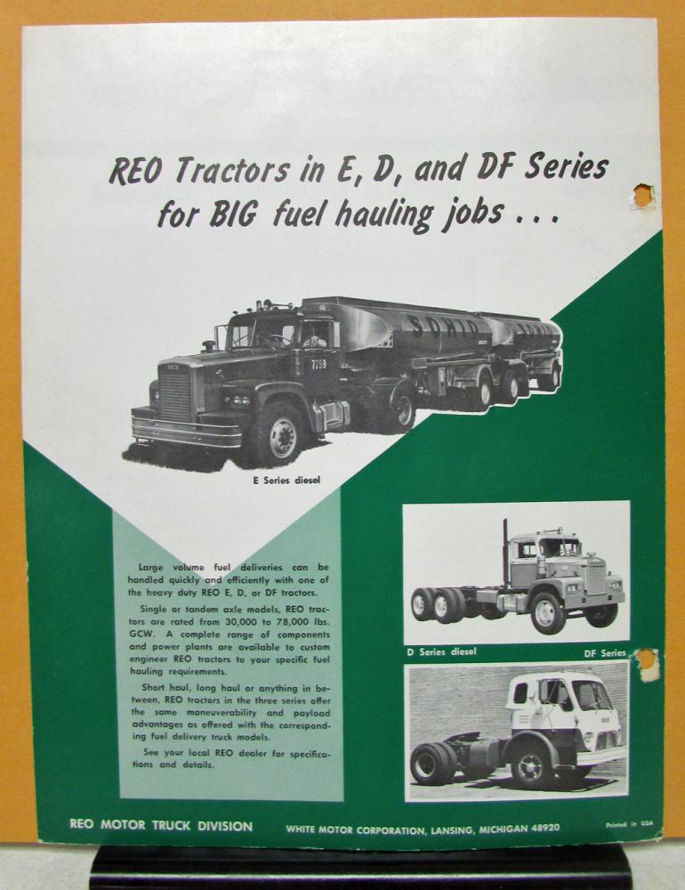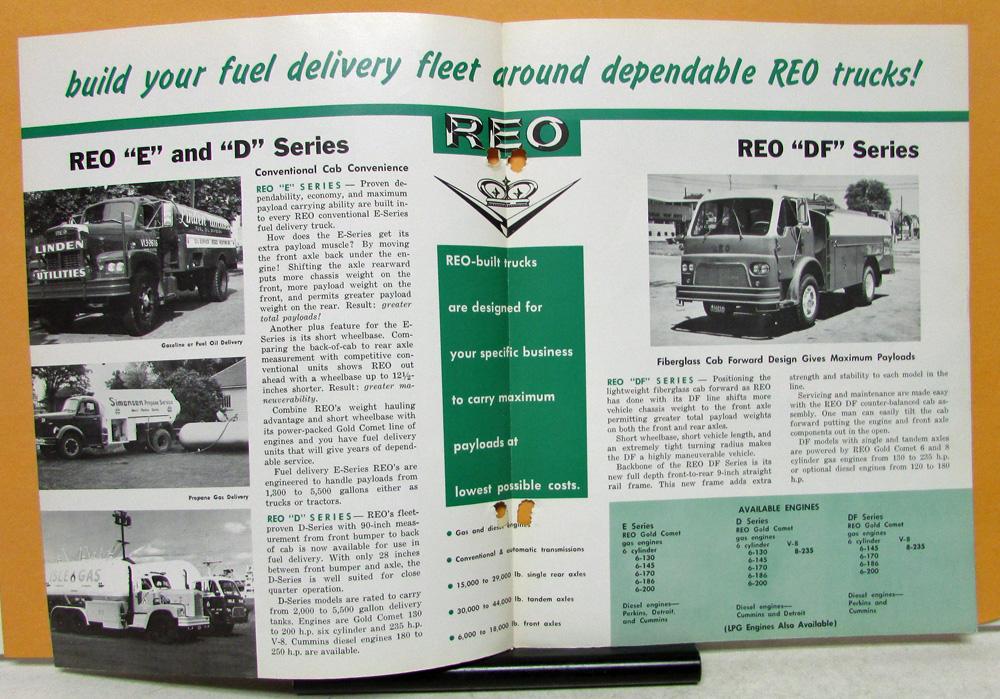 1961 1962 1963 1964 1965 REO Truck E D & DF Series Sales Brochure. This is a brochure for Fuel Delivery Trucks. Some of the companies using these trucks are Linden Utilities, Simonsen Propane Service and Isle Gas. The document has been multi hole punched and the holes are a little rough. Hole protectors have been placed on the holes.