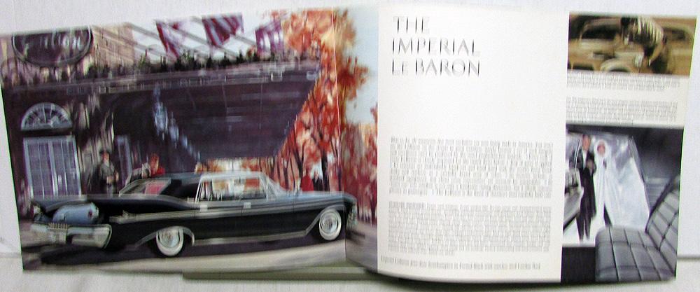 1961 Chrysler Imperial (Lebaron, Crown, & Custom), original, sales brochure with color illustrations. List of luxuries and specifications. Good condition for its age with minor wear, blemishing and soiling [see photos]. The front cover has a tear near the spine and the back cover has a Dealer Stamp.