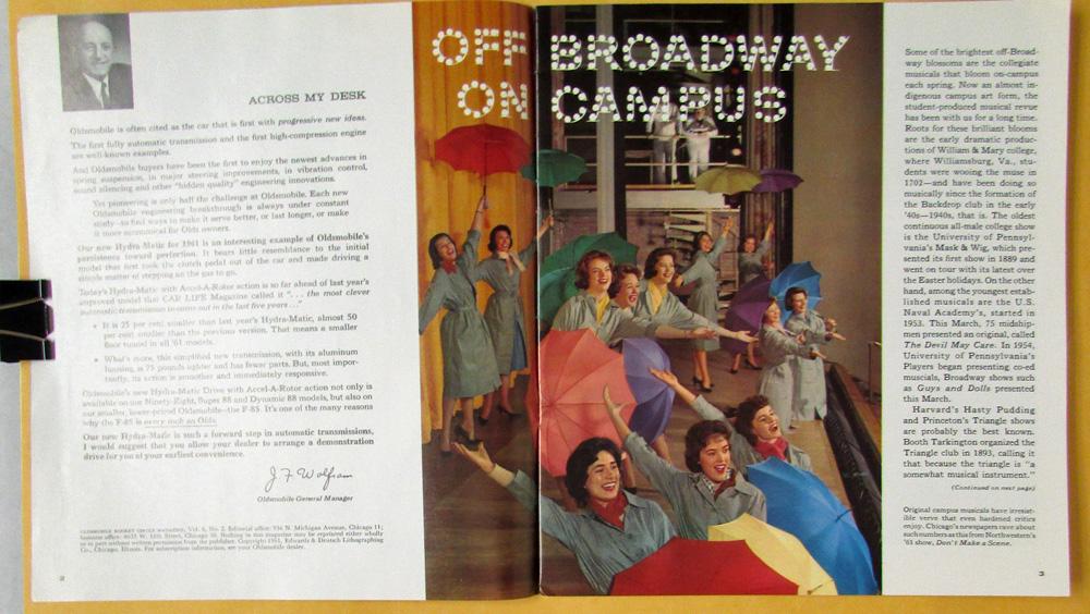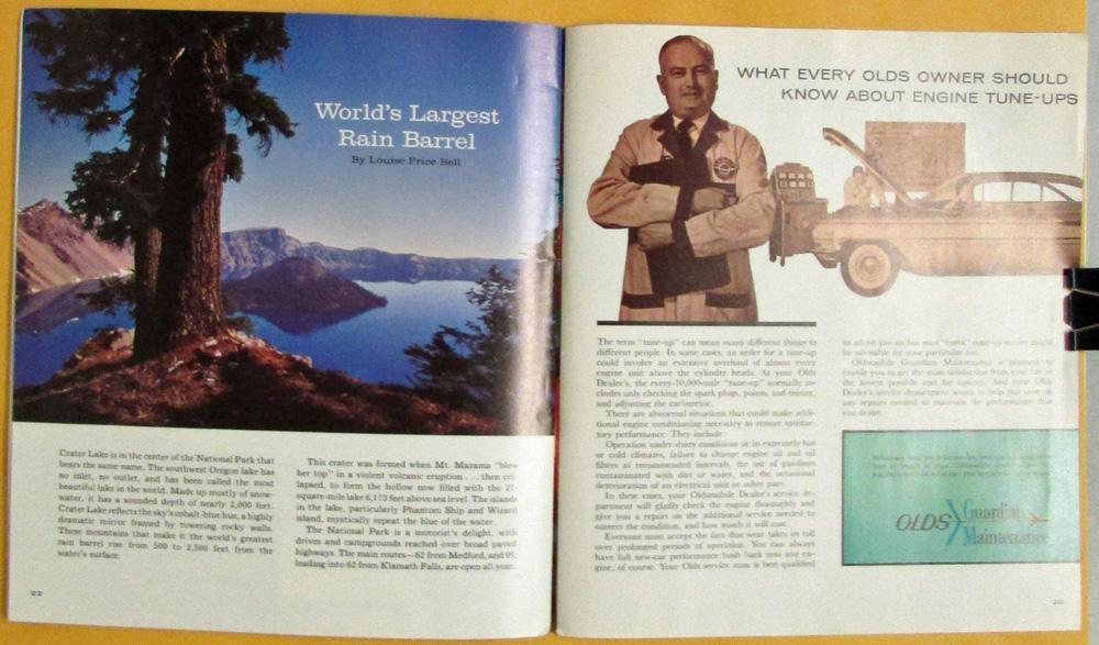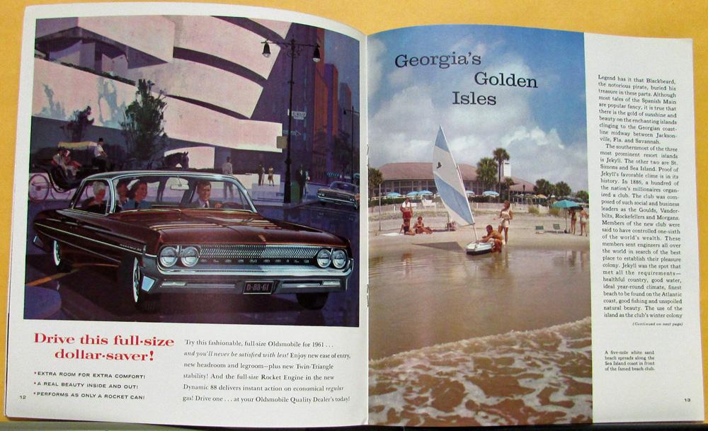 Original,1961 Oldsmobile Rocket Circle magazine, color, volume 6, number 2 issue. Complimentary magazine provided to customers with a little of something for the entire household (travel, hobbies, sports, etc.). In this issue find campus musicals, strawberry treats, Georgia's Islands and more. It is NOT addressed on the back cover; very clean condition.