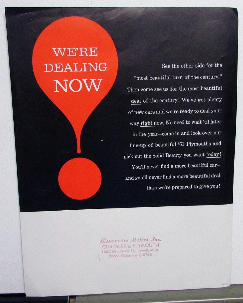 Original 1961 Plymouth Dealer Sales Brochure. This 2 sided Data Sheet highlights the Solid Beauty of the 61 Plymouths. It is in good condition with minor wear and blemishing, back has a Dealer Stamp [see photos]. Very rare and informative piece of automotive history that will display well.