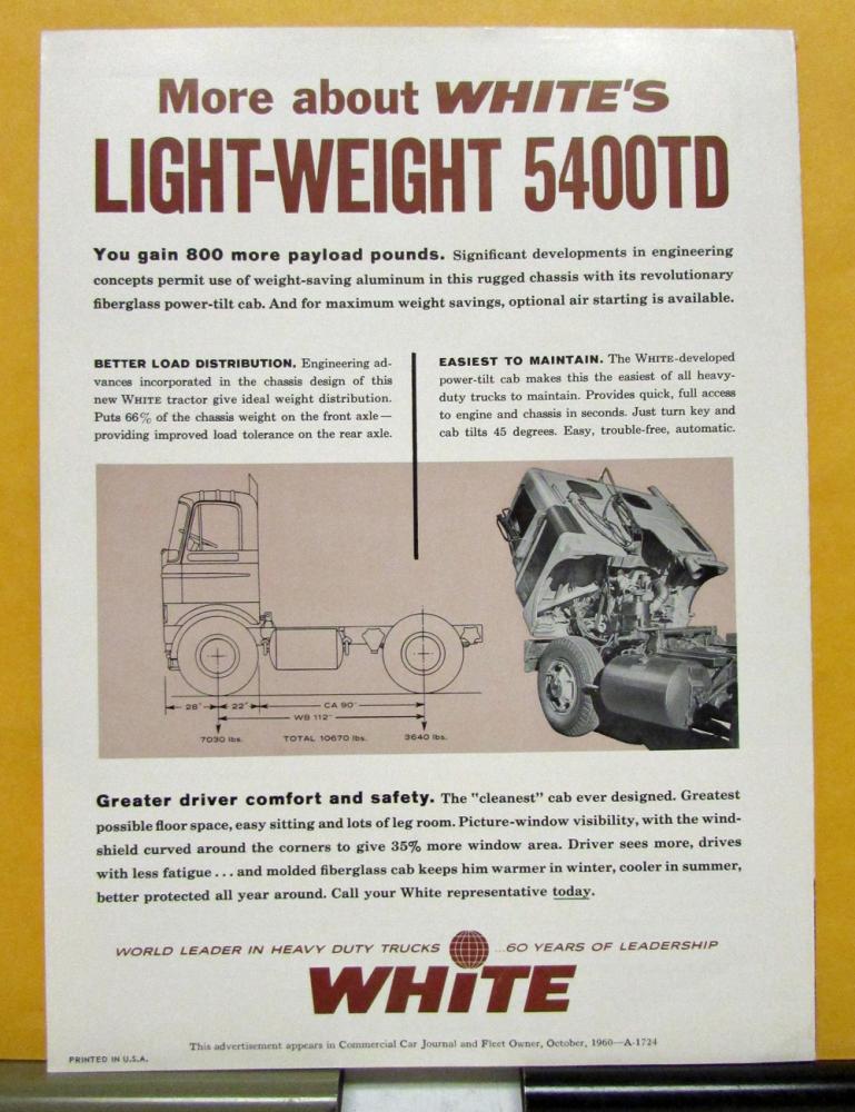 1961 White "Are your trucks down to fighting weight?" Sales Brochure. Models included in the brochure are the 5400TD, 9000TDL and 4400TDL. Nice illustration of the models on the inside pages along with information on features.