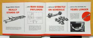 1961 White Truck Model 9064 Engineered For Construction Equipment Sales Folder. The front page shows the truck taking a load from a bucket crane. The next fold shows some of the truck features. The full fold out has a nice picture of the truck showing some of its features with the bottom having pictures of the truck in action.