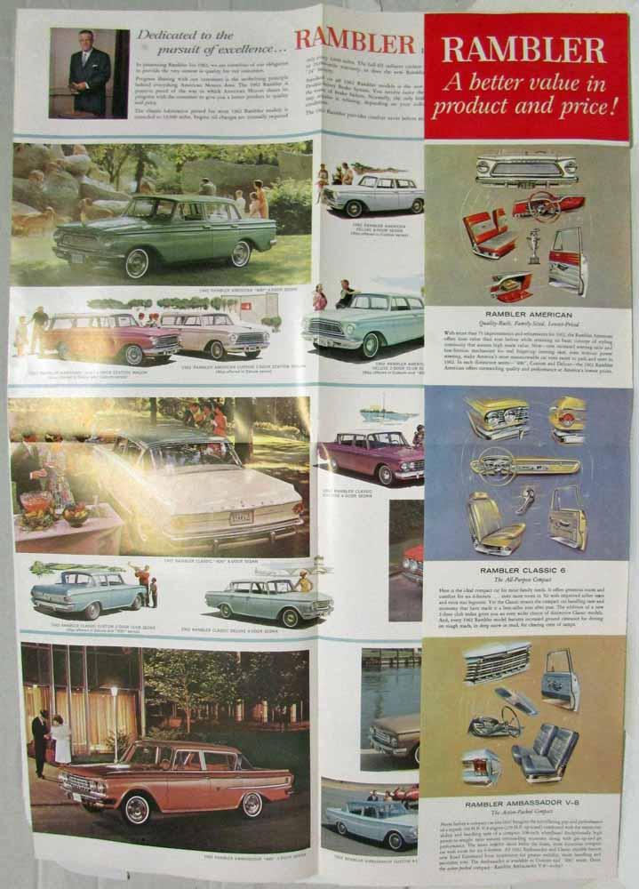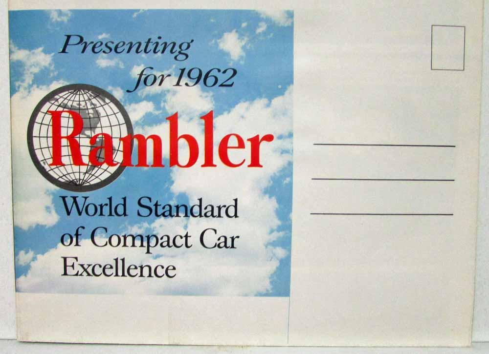 1962 AMC Rambler New Style Sales Folder Mailer. Rambler for 1962. New Style. New Savings. New Safety. Stikingly beautiful interiors, smartly color-keyed, enhance the beauty of Rambler for 1962. Rambler features and options, many of them exclusive, are further proof of the extra quality in Rambler for 1962. Features Rambler American, Rambler Classic 6 and Rambler Ambassador V-8. Condition: Small holes where folds meet. Small hole in front cover under rear of white Rambler goes halfway through brochure. Meant to be folded one more time for mailing, but has not been. Lower right-hand page has been bent. See pics.