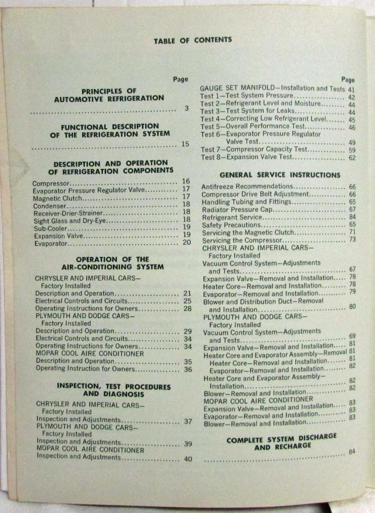 The information contained in this manual covers the operating principles, construction, components, testing procedures, maintenance and repairs. The special tools the technician will require to properly test and service an automotive air-conditioning system are listed at the back of the book. A Table of Contents is placed at the front of the manual.