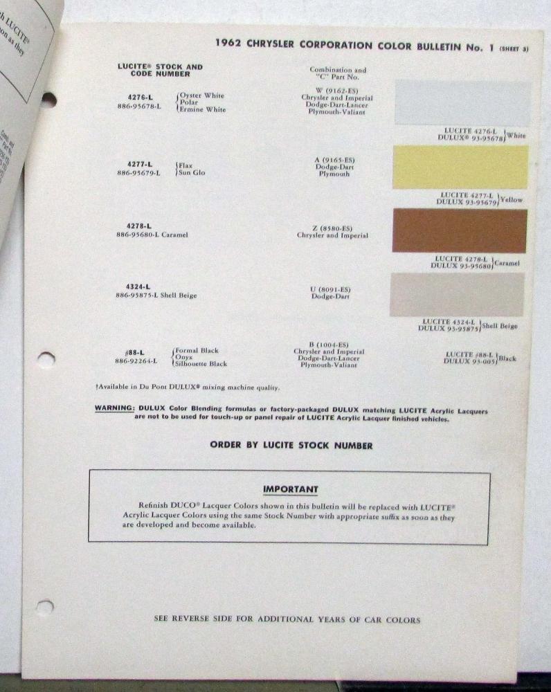 This is an original color bulletin that features the 1962 Chrysler, Imperial, Dodge Dart, Lancer, Plymouth Valiant, and Dodge Truck automotive paint chips. It is in good condition, however, does have some signs of wear, the pages are stapled, etc, see photos for reference. This is a great piece of history and a must-have for any automotive enthusiast!