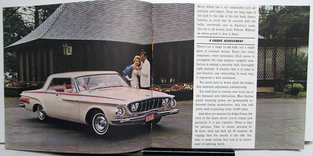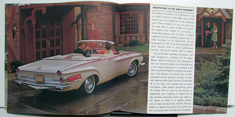 1962 Dodge Polara 500 color, over-sized, sales brochure with standard and optional equipment, and facts and measures. Color photographs. The cover is textured card stock with raised embossed lettering on the front cover. Very good condition with minor wear and discoloration [see photos].