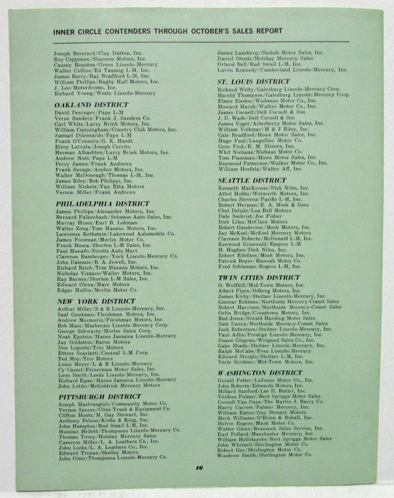 1962 Lincoln-Mercury Sales Leader December. Published by the Lincoln-Mercury Sales Council for L-M Retail Salesmen. Season's Greetings to all L-M Salesmen from the Sales Council. In this issue: Selling ideas from prospecting to closing. Read how these top Lincoln-Mercury salesmen have become successful...ideas to get you started in 1963. My Friend, The Telephone. There's a Science to Paying Bird-Dogs. Why His Customers Stay With Him. Two Factors That Pre-Sell Your Prospects. Level with Your Prospect. He Reserves the Right to Sell Himself the Car. He Plays the Selling Game by His Own Rules. Condition: Some rust marks and some rusty staples. See pics.