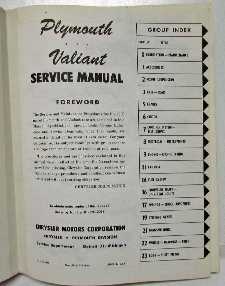 1962 Plymouth Valiant Service Shop Repair Manual. ORIGINAL.