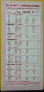 Original complete-line full-line Dodge Trucks Specifications sales brochure. Read about features, performance, and condensed specs on all the models (gasoline, diesel, conventional, 4x4, 4x2, cab-forward, forward-control, 6x4, power wagons, school bus). Dealer only item/salesman's reference. Good condition, staples have some oxidation.