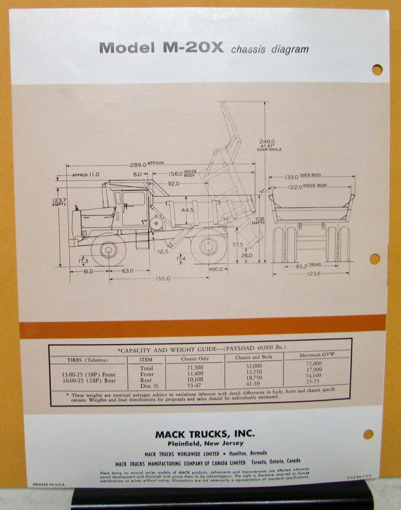 1963 Mack Truck Model M-20X Specification Sheet with Chassis Diagram. Has been multi hole punched.
