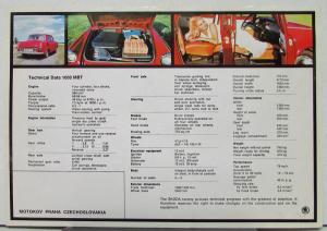 Original, color two-sided, sales AD/data sheet for the 1000 MBT model by Skoda. ENGLISH Text. Photos and technical data. Good condition. Skoda is a Czechoslovakian-built automobile. Specific model year unknown/no reference dated printed on literature.