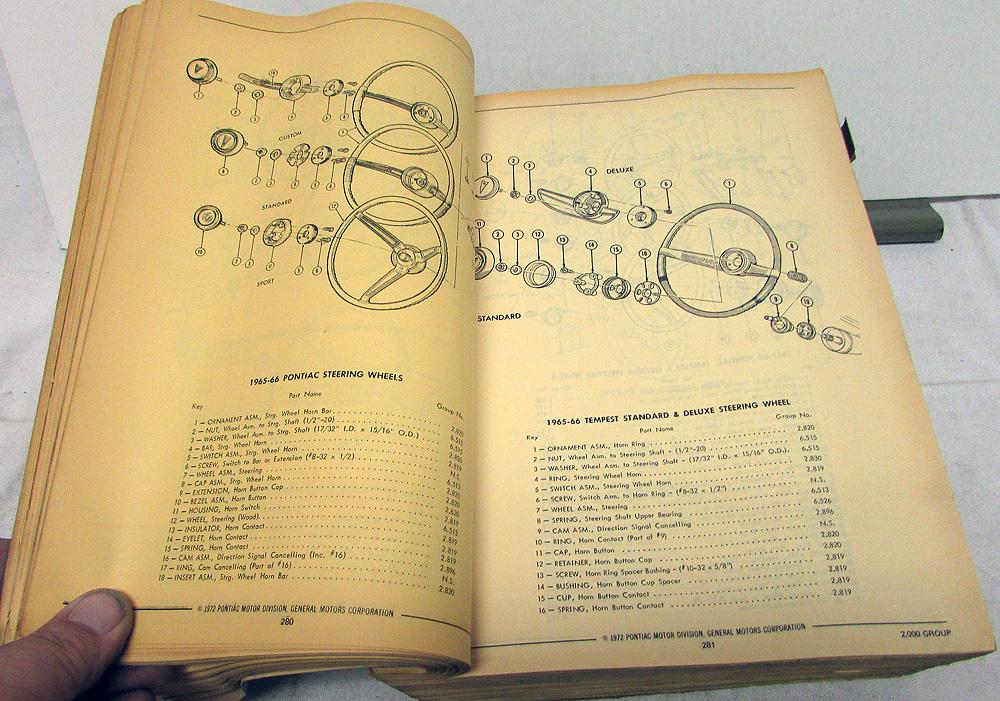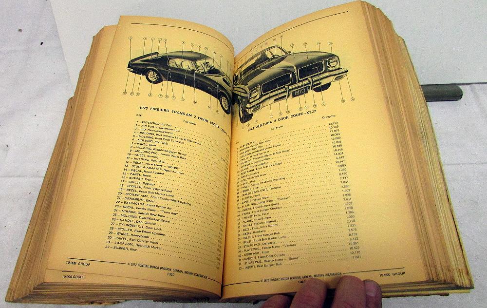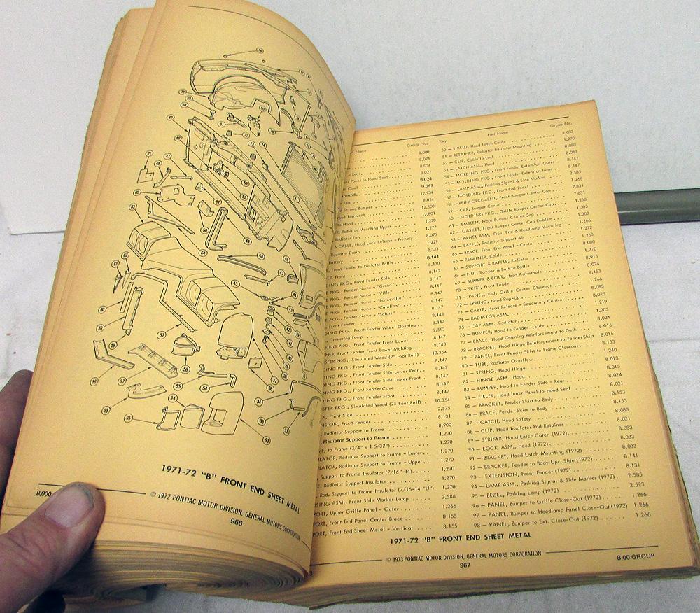 Original 1964-1973 Pontiac Chassis & Body Illustrations Parts Catalog. This large Parts & Accessories Book is dated November 1, 1972. This is the very hard to find Illustrations Book only, no Text. It covers the Full Line of Pontiac Models from this period. This is what the Dealer would use to order available Factory Replacement Parts to repair your Car. It has Part Name with Group Number and exploded view Illustrations to help find the Part Number in the Text Catalog [not included]. This Catalog does not have Part Numbers but is extremely helpful in recognizing and locating Parts. It is in very good condition for its age with minor wear and soiling [see photos]. Very rare and useful tool for the Pontiac Owner or Enthusiast.