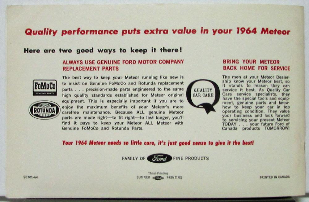 Original, NOS, 1964 Mercury Meteor CANADIAN registered owner's manual. The manual provides information for the car owner to operate and drive the car, covers general care, maintenance, lubrication, data/specs, and other valuable information. Very good condition (NOS).