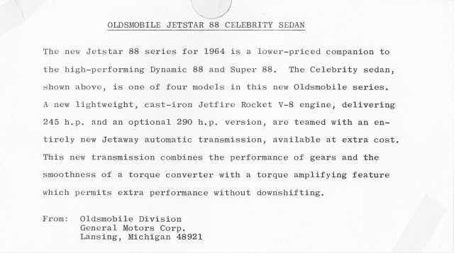 1964 Oldsmobile Jetstar 88 Celebrity Sedan Press Photo and Press Release.