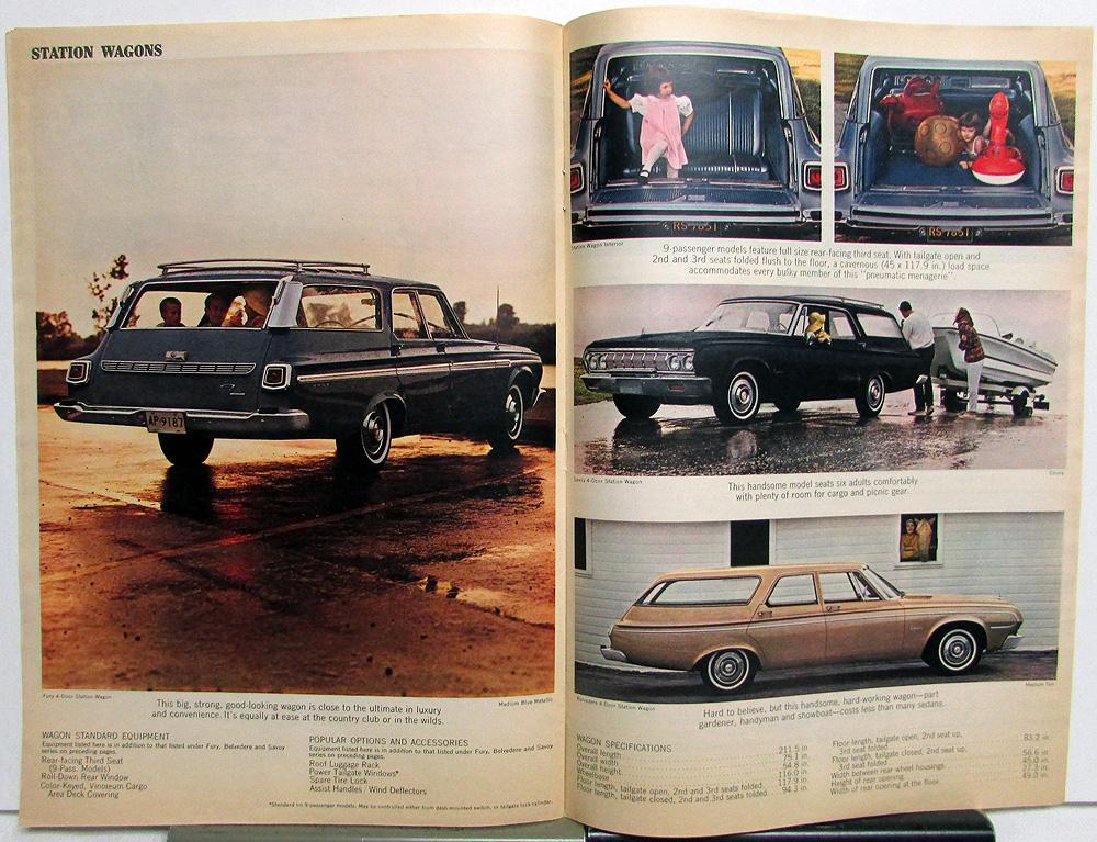 1964 Plymouth Fury, Sport Fury, Savoy and Belvedere (and wagon) color, original, dealer sales brochure. Color photos throughout. Photos of color exteriors and interiors. Features and equipment listed along with popular options and accessories per model. Specifications. Roto in U.S.A. Code No. 81-505-4018. Measures 9.25 x 13.25 with 20 pages. Good condition for its age with minor wear, discoloration and soiling [see photos].