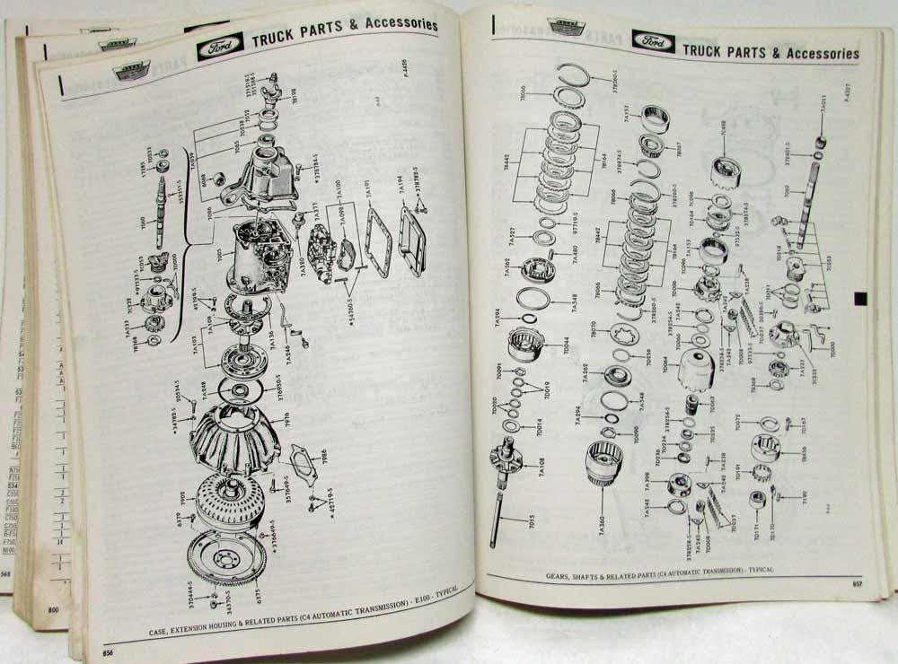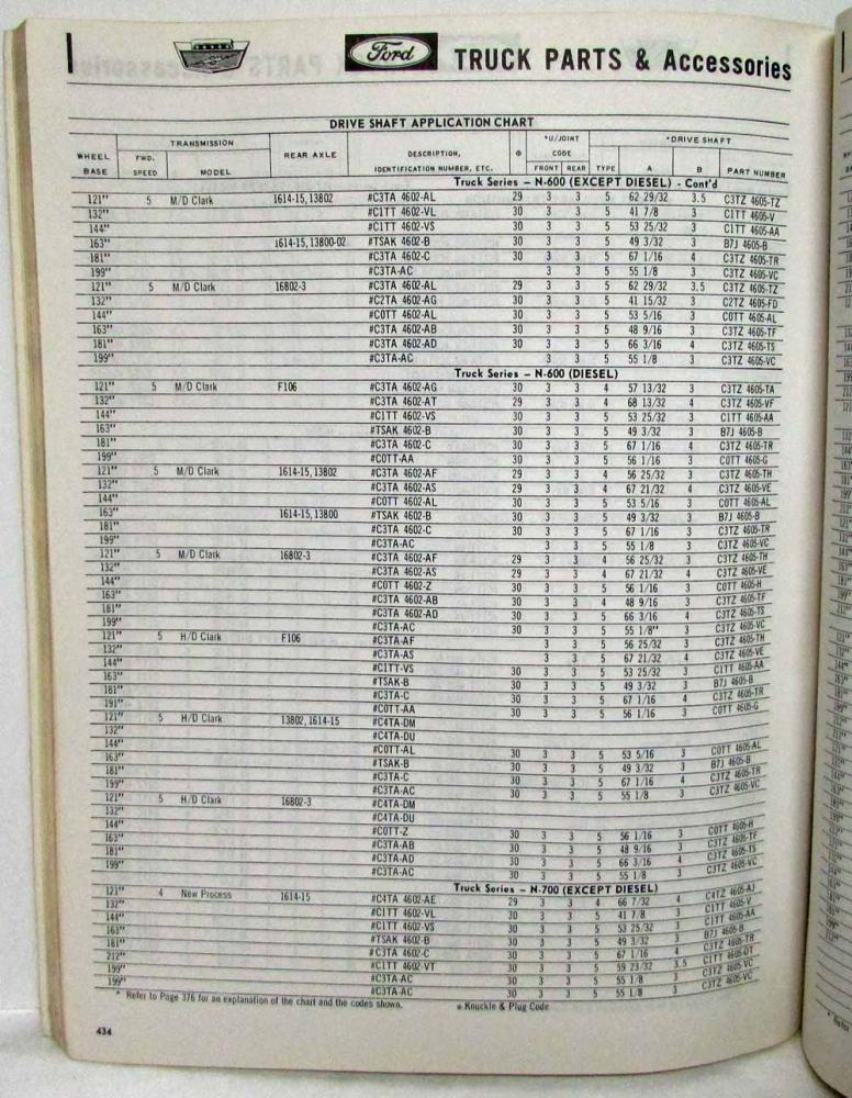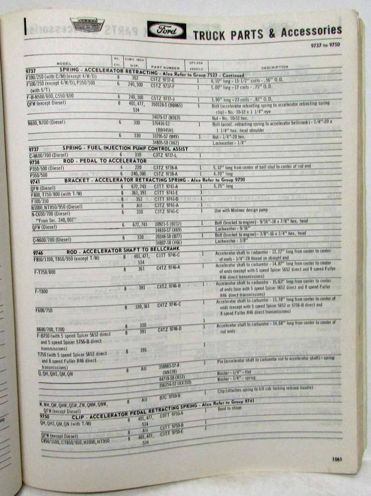 Original 1965 Ford Truck Parts Catalog. Covers ALL models from the F100 to the T-950-D Two & Four Wheel Drive Gas & Diesel Engines Includes the following sections General Information Accessories Wheels, hubs, Drums Brakes Front Axle Steering Gear Rear Axle Drive & Coupling Shafts Frame Muffler Springs Engine Transmission (Standard) Transmission (Automatic) Transmission (Transmatic) Radiator & Grille Fuel System Alternator Starting Motor Distributor, Ignition Coil Lamps & Wiring Fenders & Running Boards Hood Speedometer Windshield Wiper Shock Absorbers Miscellaneous Accessories Body Parts Index Body Parts Soft Trim Illustrations this catalog was printed by Ford and copyrighted 1964, Form FD 7753-64, 1364 pages. This manual lists every part for the 1966 truck models that Ford produced and was used by Ford dealerships to order parts from the factory. An invaluable tool if you own one of these trucks.