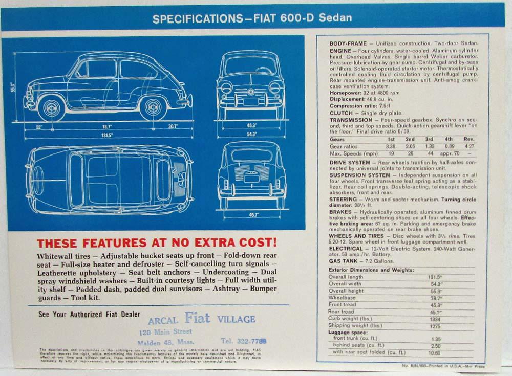 1965 Fiat 600D Sales Folder. Original.Promotes the 600D and includes specifications on the back.