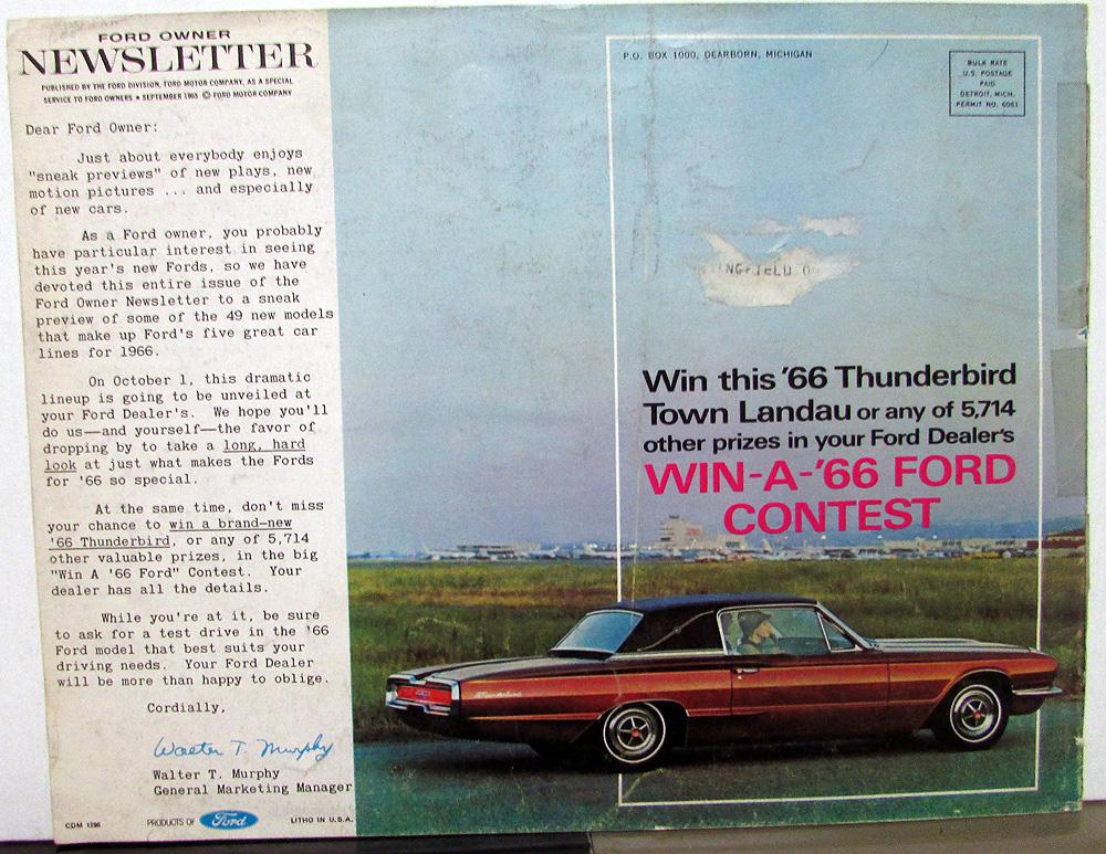 1966 Ford Preview Sales Mailer, featuring info on new models: Full Size, Mustang, Falcon, Fairlane, and Thunderbird. It included info on Win-A'66 Ford Contest. It is in good condition. Cover is loose from brochure, has some wear and blemishing while inside pages have minor wear.