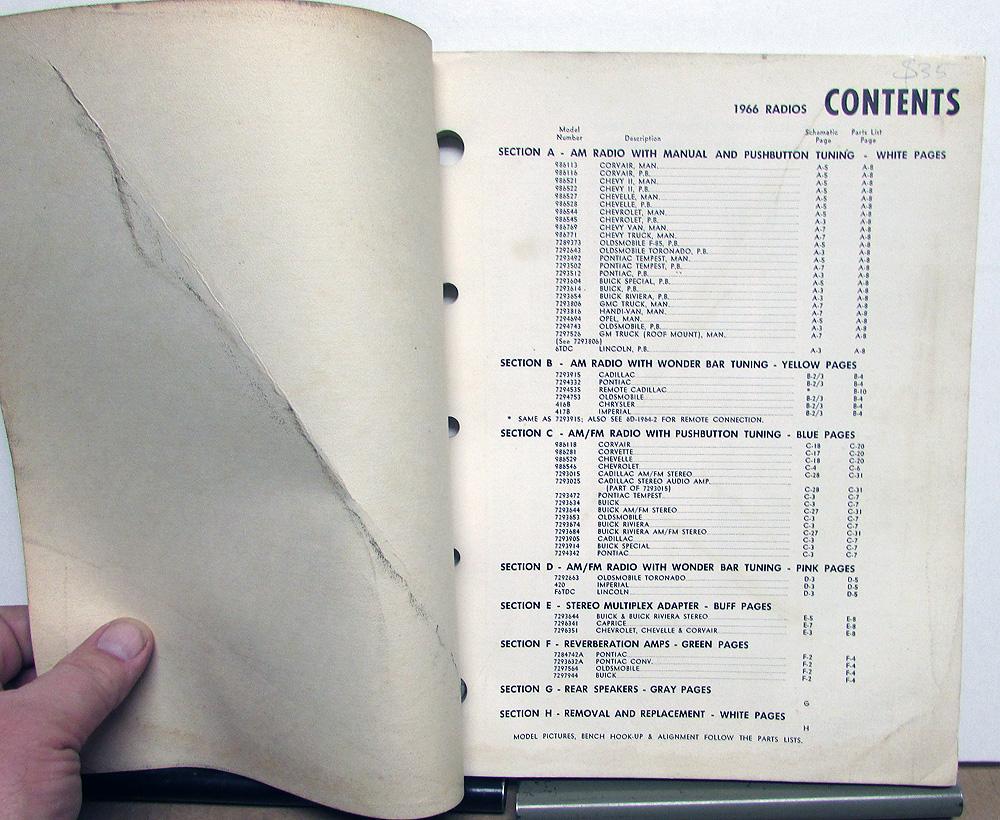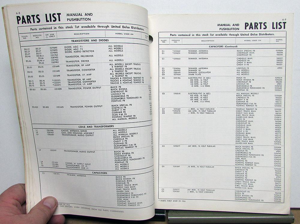 1966 Delco Radio Service Manual. This Shop Manual was used by Dealers and Garages to repair Delco Radios in Buick, Cadillac, Chevrolet, GMC Truck, Oldsmobile, Pontiac, Chrysler, Imperial and Lincoln Models. It has information, Parts List, Schematics and Service Instructions to aid in the repair of these Radios. It is in good condition with minor wear, soiling and blemishing [see photos].