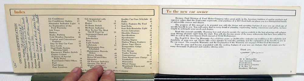 1967 Ford Falcon Owner's Manual ORIGINAL. This manual contains operating instructions, maintenance and service specifications for this vehicle. Good condition with minor soiling and blemishing [see photos]. The front cover has writing on it.