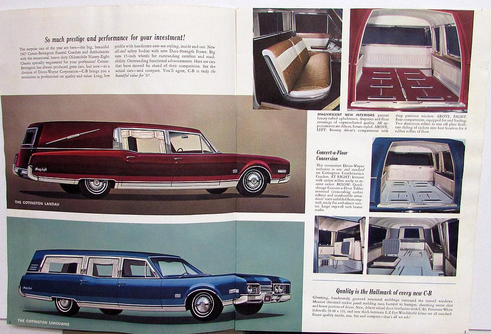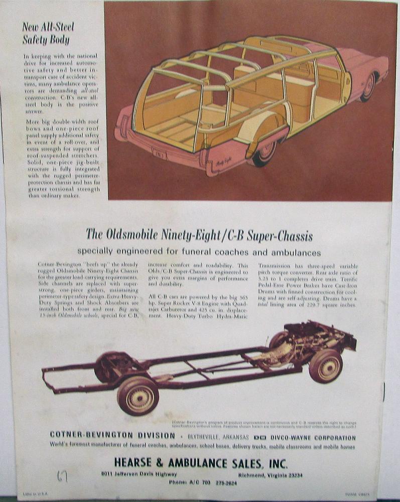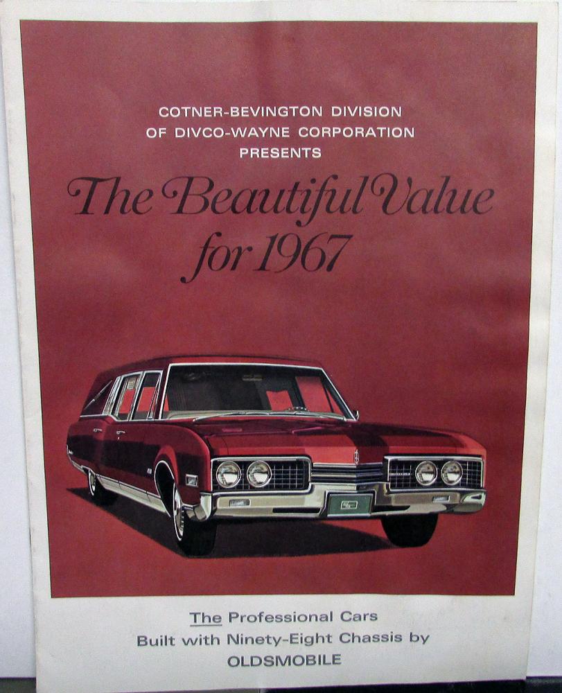 Original 1967 Cotner-Bevington Professional Car Dealer Sales Brochure. This well illustrated Brochure highlights the custom Limo, Hearse and Ambulance Models offered in 1967. These were all based off of the Oldsmobile 98 Chassis. Overall very nice item, the top 2 inches has some slight rippling. No stains or marks. Could have been the way it was stored.