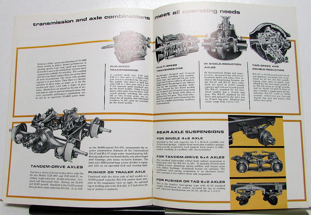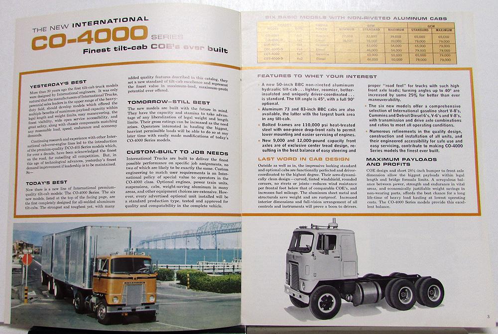 1968 1969 1970 International Harvester Truck Model CO-4000 COF-4000 COT-4000 Sales Brochure. The front page has a great picture of a truck-trailer going under a highway. The inside and back pages have great pictures and talk about the various features of the truck. Good condition with minor wear and discoloration [see photos].