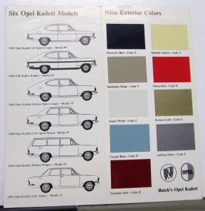 Original 1968 Buick Opel Kadett Dealer Sales Brochure. This small Folder has Color Paint Chip Samples and the back cover has Specifications for the Opel Kadett Models. The cover has minor wear and scuffing while rest is good with minor wear and discoloration [see photos].