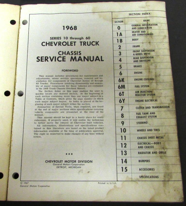 Good original 1968 Chevrolet Truck Dealer Chassis Service Manual. This Manual covers the Series 10-60 Truck Models for 1968. These have Information, Illustrations, Diagrams, Specifications and Procedures. These are what the Dealership used to repair your Truck. Very informative and useful tool that is hard to find since they were not available to the public.