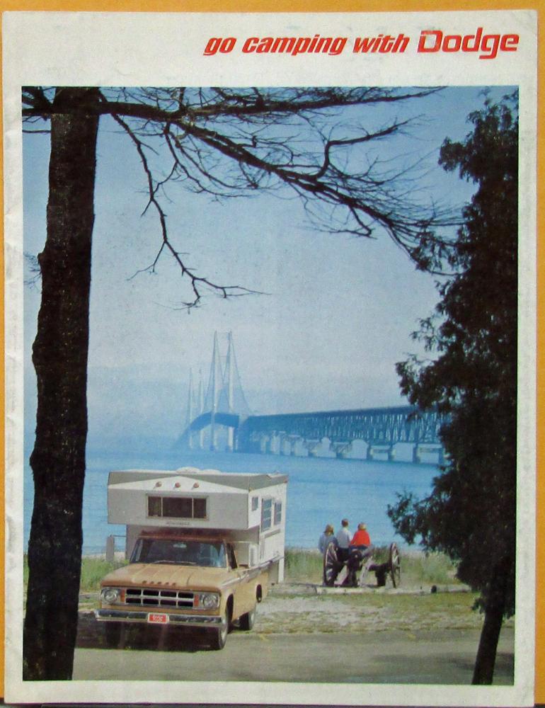 1968 Dodge "go camping with Dodge", color, sales brochure, original. Read about sportsman camper conversions, pickups, crew-cabs, motor homes, and much more. Read about essentials for camping with your vehicle (tires, springs, engines, transmissions). Standard equipment and optional equipment, engines and more. Towing information and hitch restrictions. Brochure has some light staining on front and back covers; inside pages fairly clean, dealer stamp on back cover.