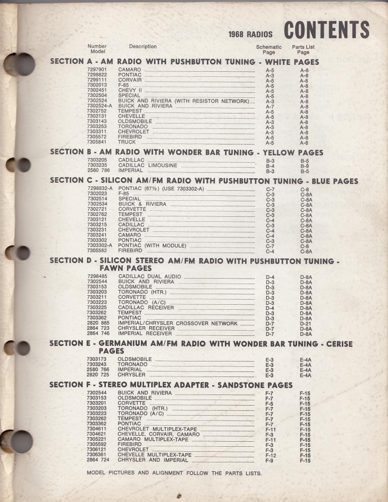 1968 Delco Radio Service Manual. This Shop Manual was used by Dealers and Garages to repair Delco Radios in Buick, Cadillac, Chevrolet, Oldsmobile, Pontiac, GMC Truck, Chrysler, Imperial Models. It has information, Parts List, Schematics and Service Instructions to aid in the repair of these Radios. It is in good condition with minor wear, soiling and blemishing [see photos].