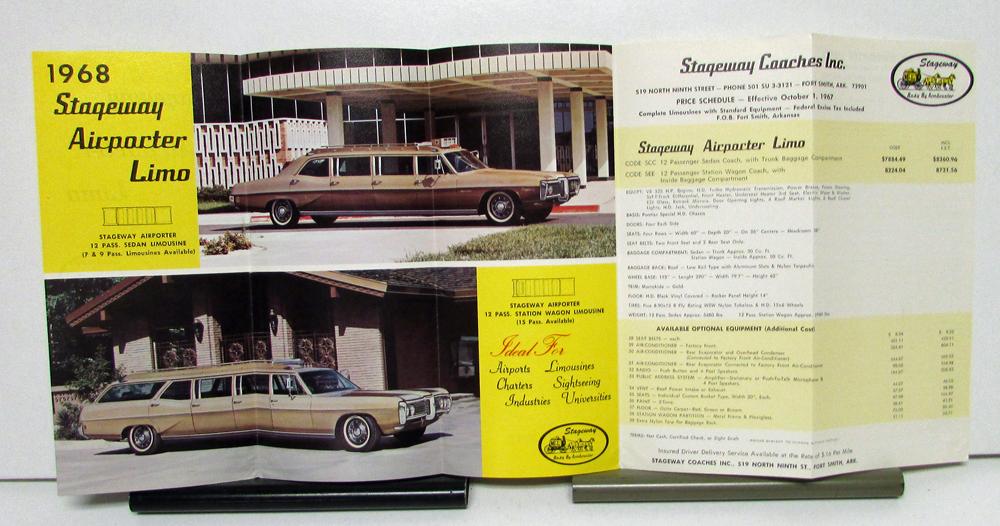 1968 Pontiac Armbruster Stageway Airpacter Limousine Sales Brochure. The front pag states "Stageway Airpactor Limo". When folded out you see two pictures of the limousine along with pricing information. There is also Standard Equipment Specifications. The evelope the brochure was mailed in is also included.