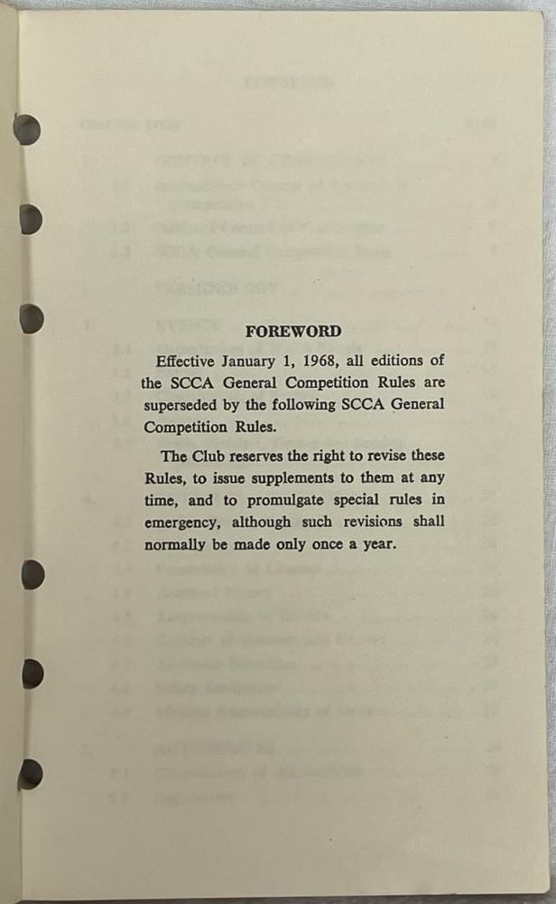 Effective January 1, 1968, all editions of the SCCA General Competion Rules were superseded by this copy. Of course, there have been many editions since. The club reserved the right to revise the Rules, to issue supplements to them at any time, and to promulgate special rules in emergency, but revisions were normally made only once a year.