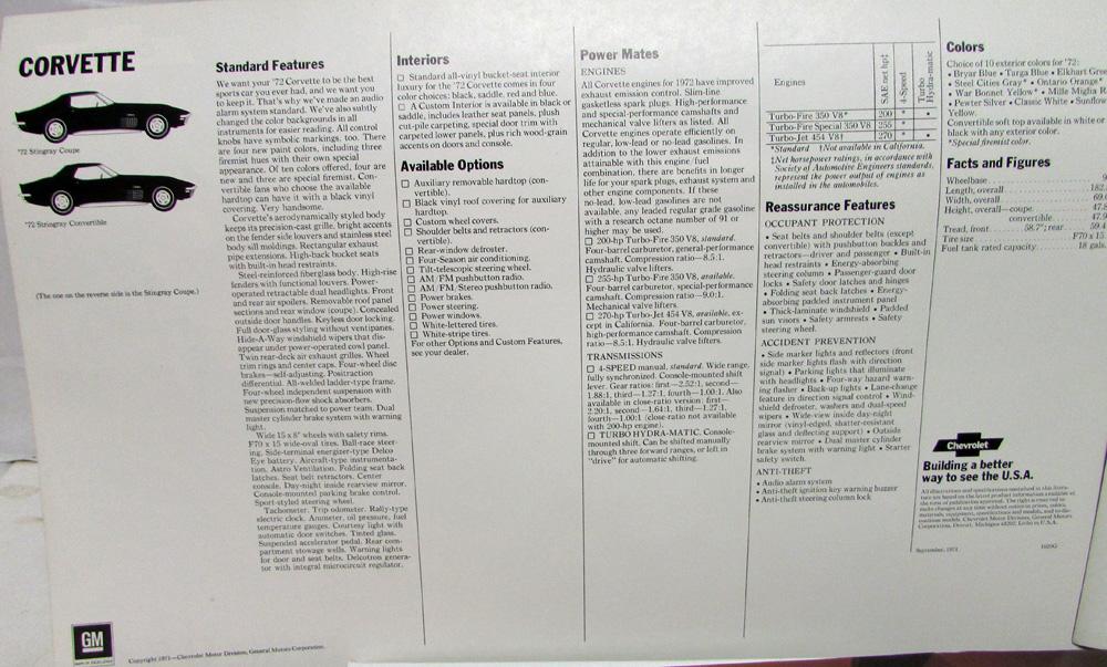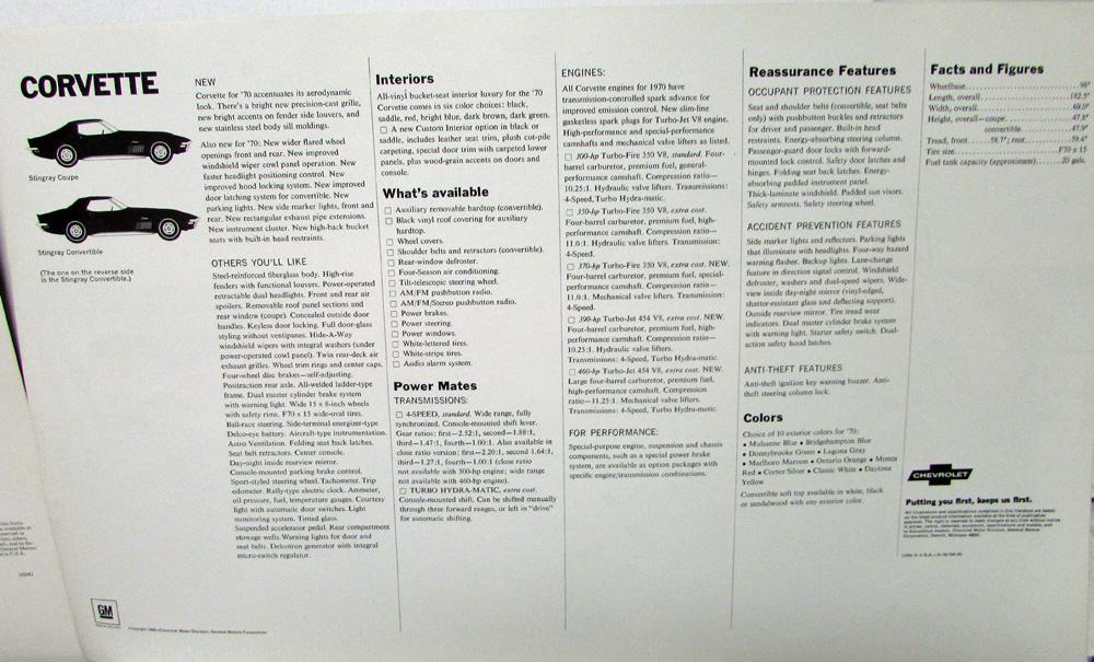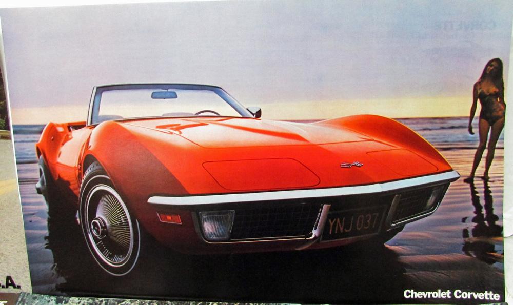 Set of 5 original 1969-73 Chevrolet Dealer Showroom Posters. These would have been displayed in the Dealership and given out to Customers to highlight and promote the new Chevy Models. These highly detailed color Posters have Features and Specs on the back. The 5 Models on these Posters are 1969, 70, 71, 72 and 73 Corvette Models. They are in very good condition with very minor aging and will look great framed. The 1972 and 73 Posters are 1" narrower than the others. Very rare and cool piece of automotive history that will display well.