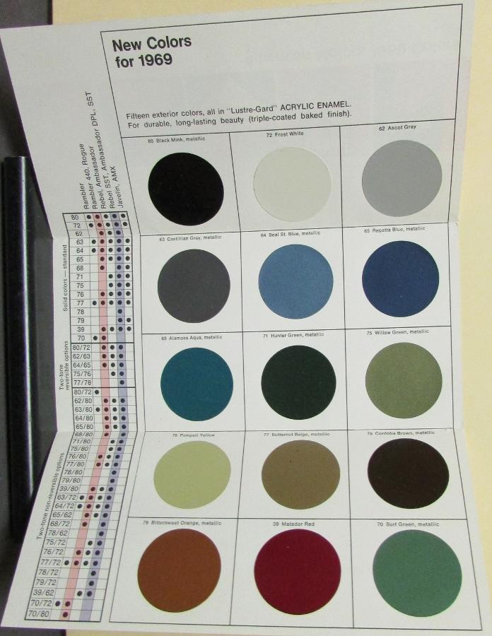 1969 American Motors AMC color paint chips sales brochure, original, for the Ambassador, Rebel, Javelin, AMX, and Rambler. One-page, two-sided, accordion folded brochure. Paint chips are circle shaped.