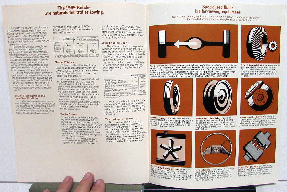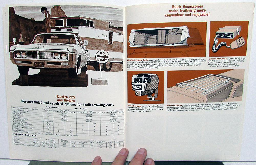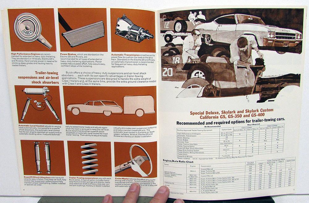 1969 original, color, Buick Trailer Towing Handbook, sales brochure. Read about specialized equipment, recommended and required options, engine/axle ratio, and driving tips. Specifications for towing in: Electra 225 and Riviera, LeSabre and Wildcat, Special Deluxe Station Wagon and Sportwagon, and Special Deluxe, Skylark and Skylark Custom California GS, GS-350 and GS-400. Good condition with minor wear and soiling [see photos].
