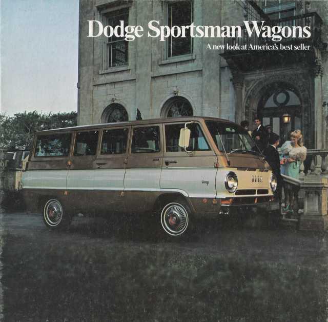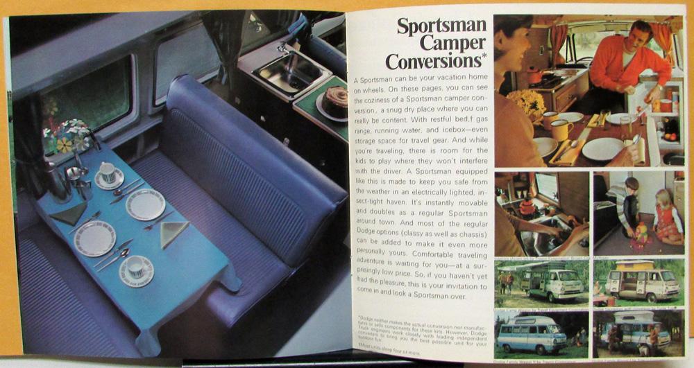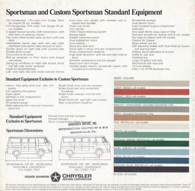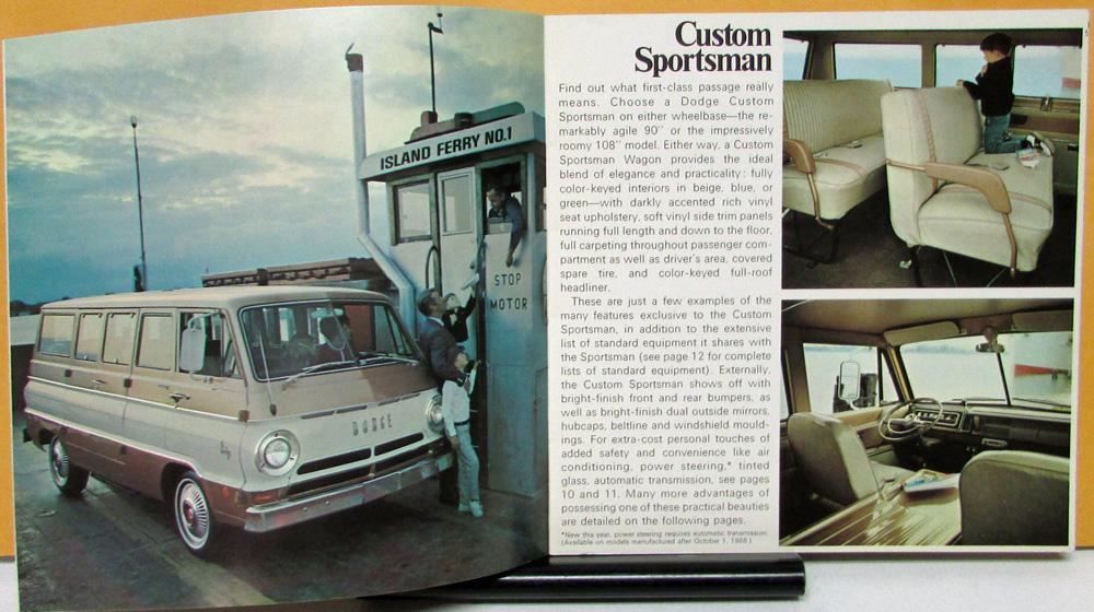 1969 Dodge Sportsman Wagons, color, sales brochure featuring the Custom Sportsman, Sportsman, and Sportsman Camper Conversion. List of standard and optional equipment, and highlights of the models. Color chart on back cover and dimensions. Back outside cover is a little scuffed and has dealer stamp, but otherwise brochure is in pretty good condition for its age.